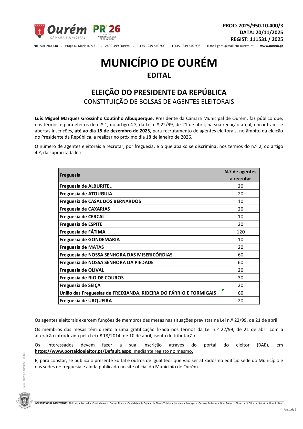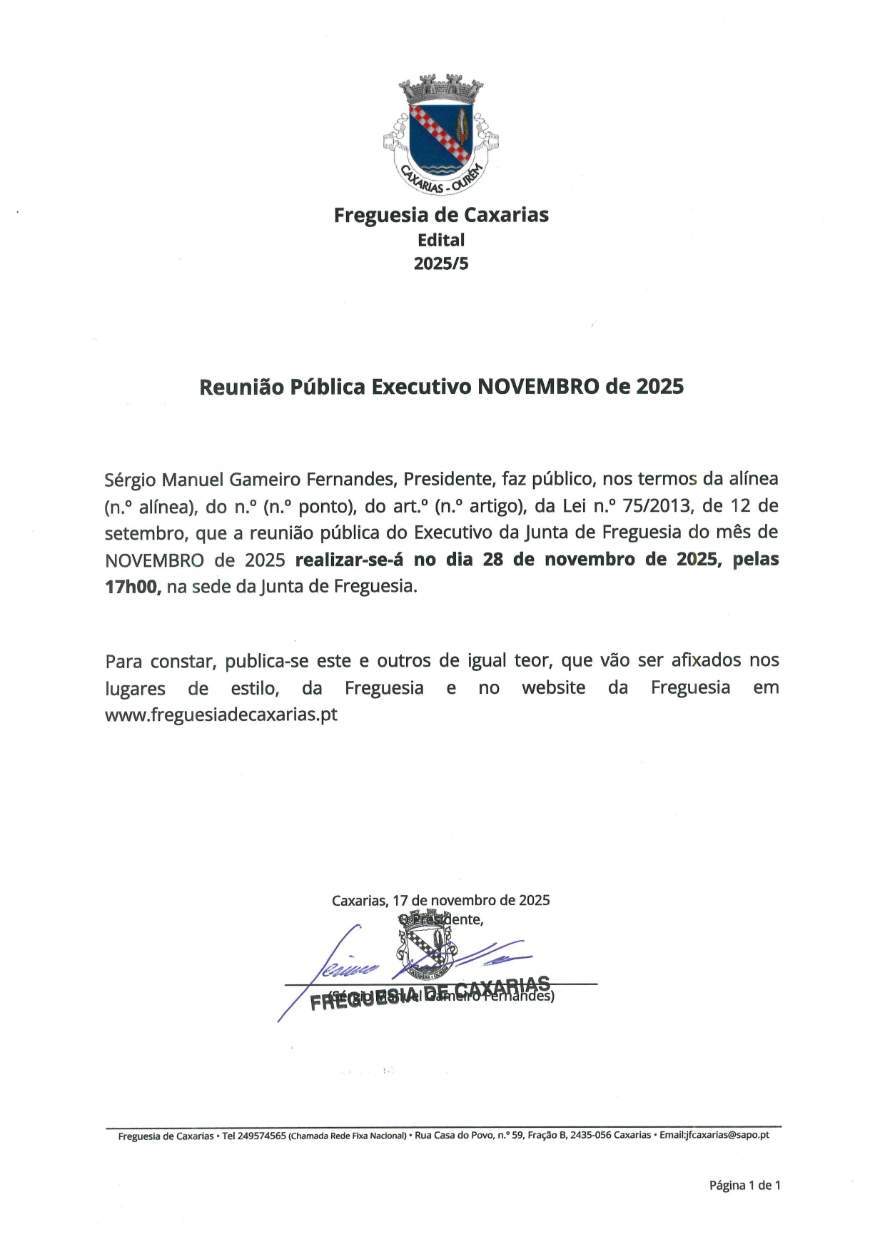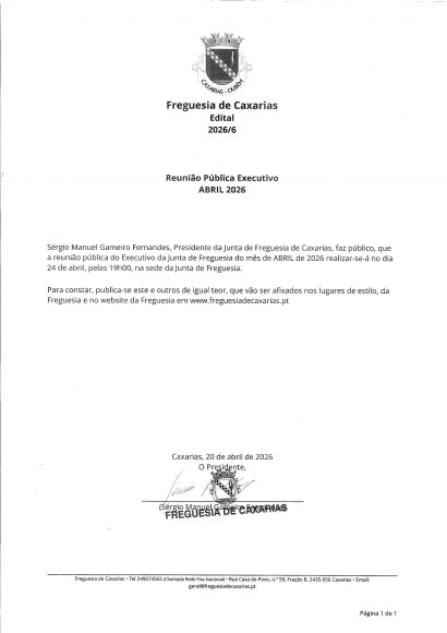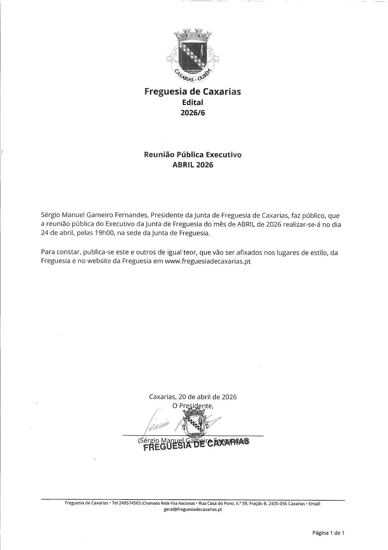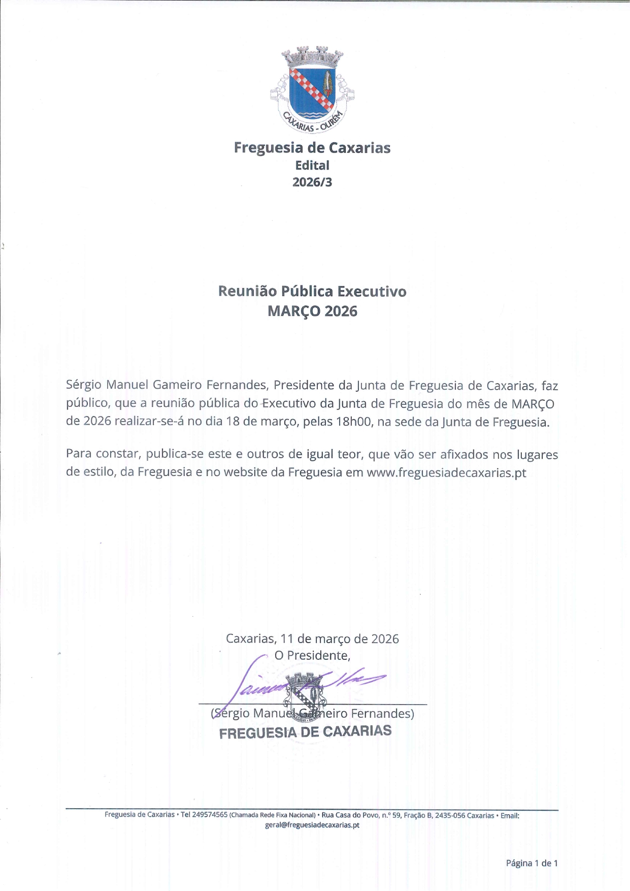 É com grande honra e responsabilidade que me dirijo a todos vós, na qualidade de Presidente da Junta de Freguesia de Caxarias, para o mandato autárquico 2025/2029.